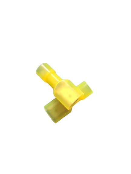 Terminal macho totalmente aislado en color amarillo, diseñado para una conexión rápida y segura en instalaciones eléctricas. Compatible con cables de 2.63 a 6.04 mm², ofrece un ajuste preciso y firme en sistemas eléctricos de baja tensión.